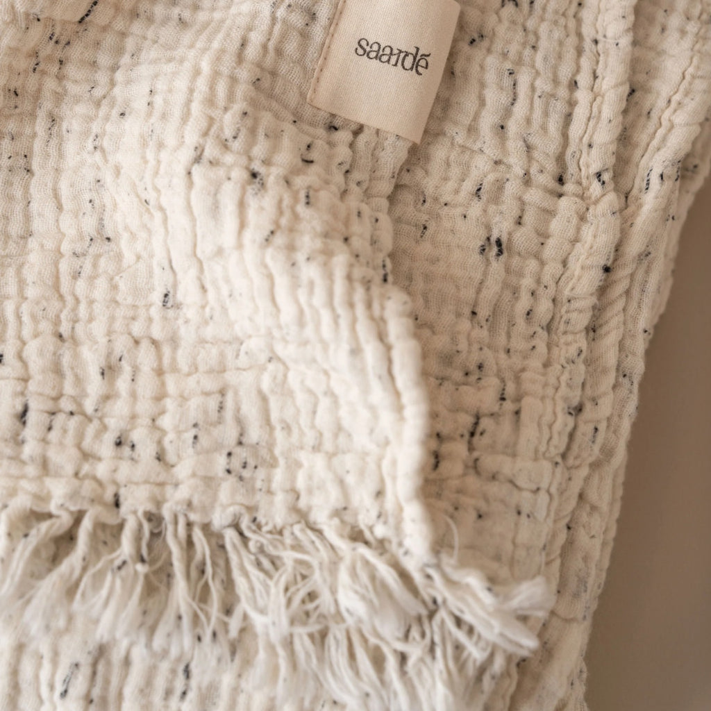 Natural cotton yarn beautifully mixed with black speckles. The yarn in this throw is boiled and then twisted together before weaving to create the cosy crinkled texture of this piece