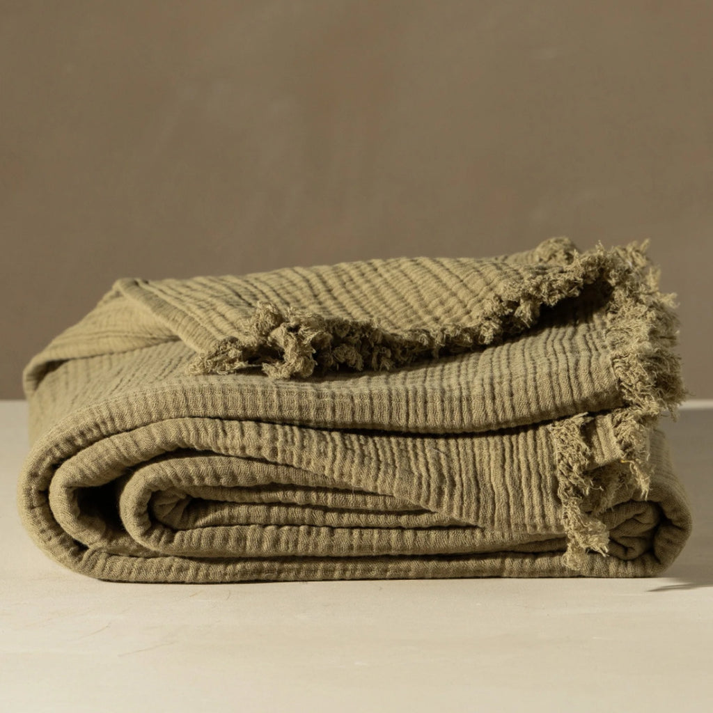 These Saardé signature pieces are made from four finely woven layers of Turkish cotton to create these beautifully crinkled and super-soft pieces. Perfect for layering - these work well over a duvet in Winter, and alone in Summer. This Extra Large Throw/ Bedcover works on a King Size Bed.