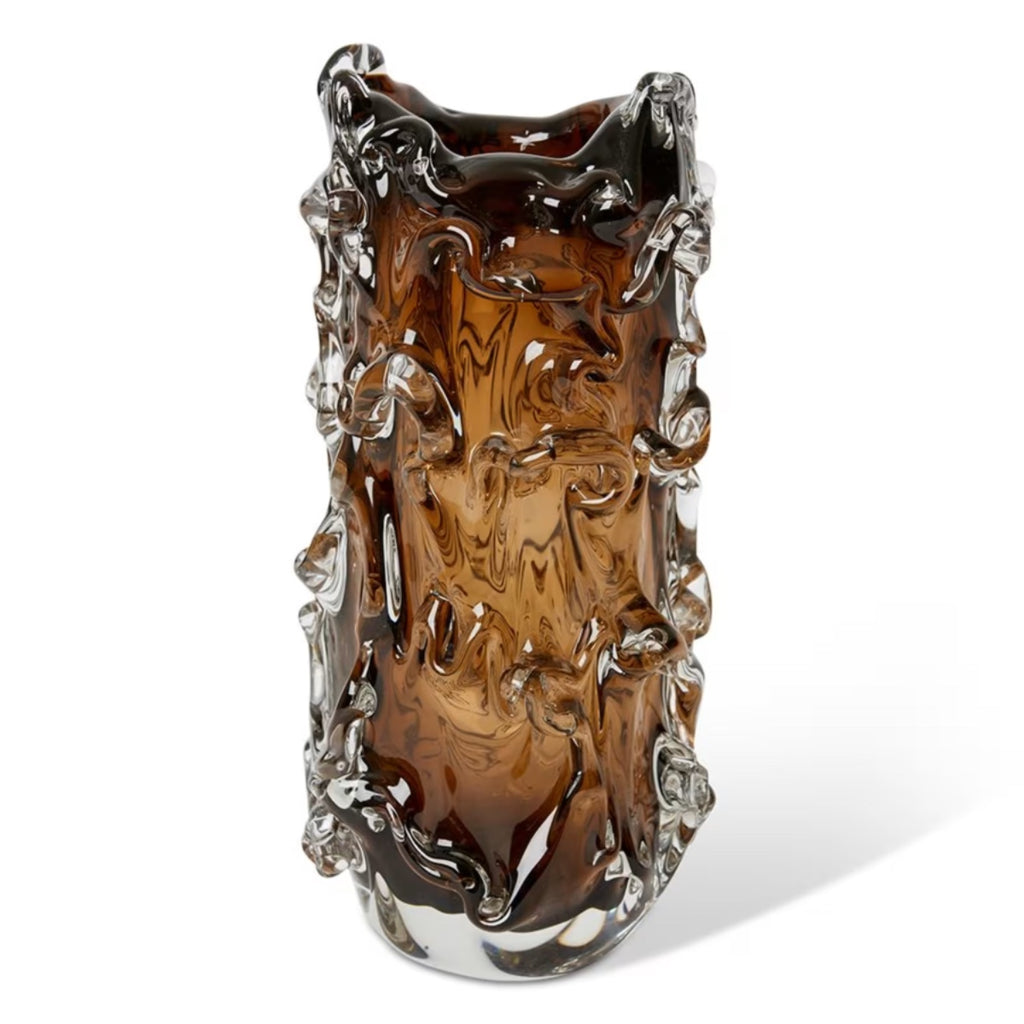 Rich Chocolate glass vase with 3D detailing in clear glass. A stand alone piece that makes a real statement.