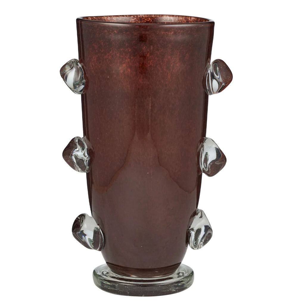 Rich claret coloured glass vessel with distinctive hand moulded clear glass detailing on the sides. A true statement piece for your sideboard, dining table or Island bench.