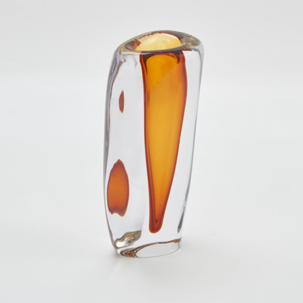 Stunning Hand blown glass vessel with striking amber coloured glass accent. This fiery piece adds a unique touch to your space.