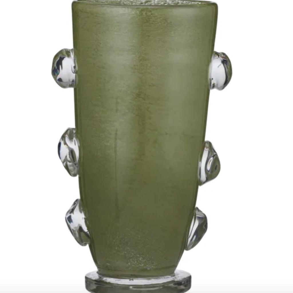 Soft Olive coloured glass vessel with distinctive hand moulded clear glass detailing on the sides. A true statement piece for your sideboard, dining table or Island bench.