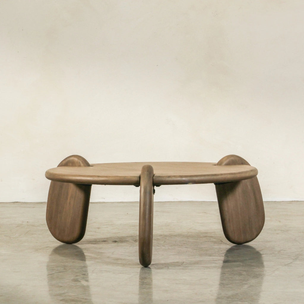 This round coffee table is playful with its three protruding round legs that give it sculptural quality. The Modernist Coffee Table is a wooden coffee table, crafted in India using high quality mango wood that has been stained with oil to enhance its natural colours.