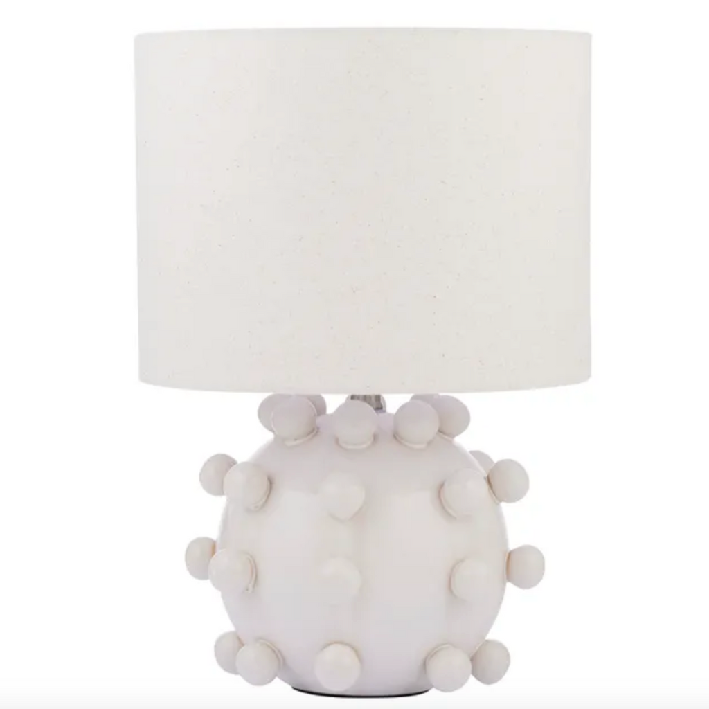 A quirky and fun ceramic lamp to add personality to your room. Ivory ceramic base with ceramic baubles, reminiscent of the Kelly Werstler style, with a warm linen tone shade.