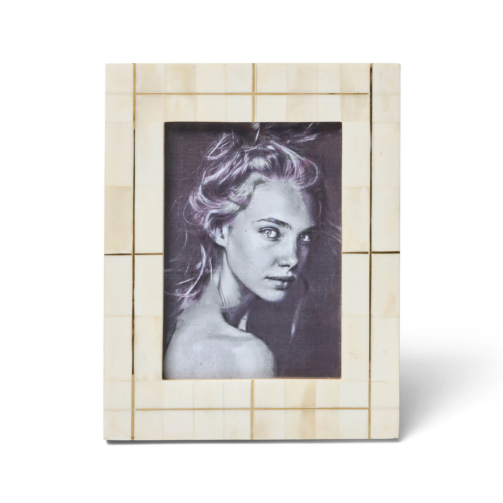 The Jiya Photo Frame is handcrafted from bone with an elegant brass inlay.