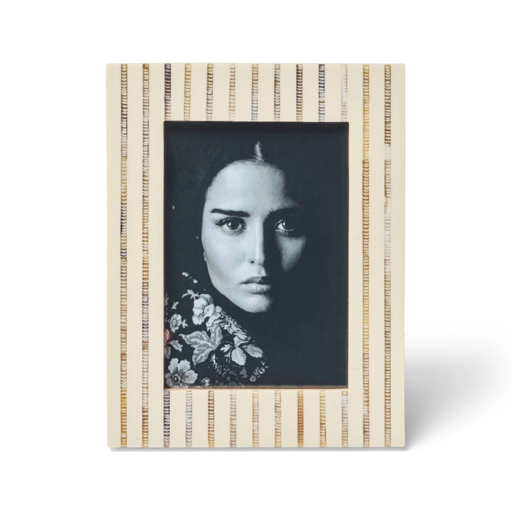 The Stripe Photo Frame has a striking design and is handcrafted from ivory coloured resin with hand-etched inlaid horn stripe.