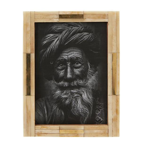Antiqued bone frame with brass inlay. Fits image size 5x7